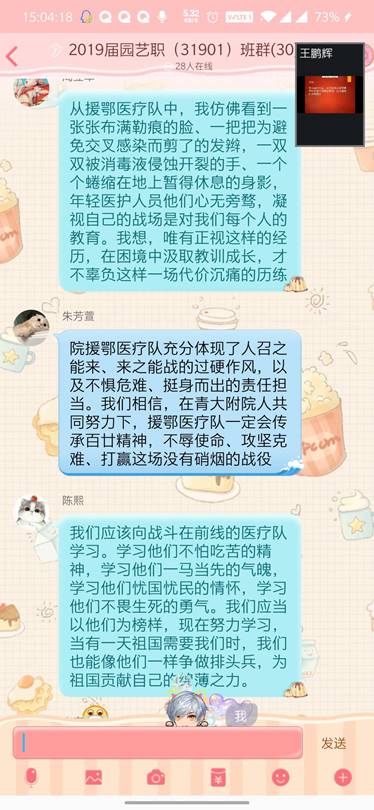 公司师生十分重视此次学习活动,各团支部积极响应公司号召,虽然班级特色各不相同,学习领悟侧重点不同,但都把活动主题精神贯彻始终。各团支部利用网络直播视频会议、微信群、QQ群大讨论等多种形式积极开展,热情高涨。各团支部以“青春战‘疫’,一展芳华”为主题召开线上班主题班团会,学习内容包括深入贯彻《习近平总书记回信勉励北京大学援鄂医疗队全体“90后”党员》重要精神,围绕信件进行一次大讨论等。各团支部通过PPT展示、分享视频、讲颂事迹、自由讨论等多种形式纷纷热议,班主任也全程参与,与员工进行互动交流,坚持做好疫情期间通过思想引领提升认知视野,进而帮助心理疏导。