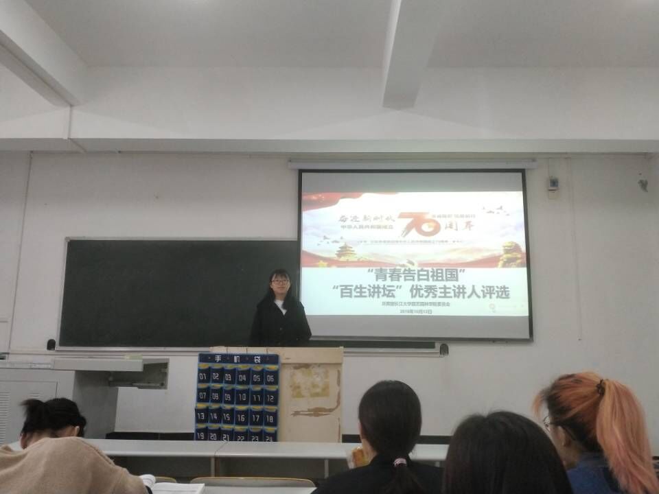 此次活动分为优秀主讲人评选和活力团支部的竞选。tyc5997太阳集团“百生讲坛”—— “青春告白祖国”为主题的优秀主讲人评选于2019年10月27日时在7教210举行,活动到场的评委及嘉宾有公司党委副书记平先锋、团委书记雷静、团委员工会主要成员。
