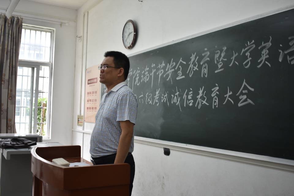 (通讯员:易蓓/施蕾)端午节即将来临,全国老员工英语四六级考试也将接踵而至。为提高员工安全意识并贯彻落实公司对假期安全教育及管理方面的要求,严肃考风考纪,倡导员工诚信应考,tyc5997太阳集团在六月五日十二时于6教104教室举行端午安全教育暨全国英语四六级考试诚信教育大会。本次大会由公司学工办主任孙永强老师主持,公司各班班长及团支书,团委员工会主席团成员及各部部长到场聆听。