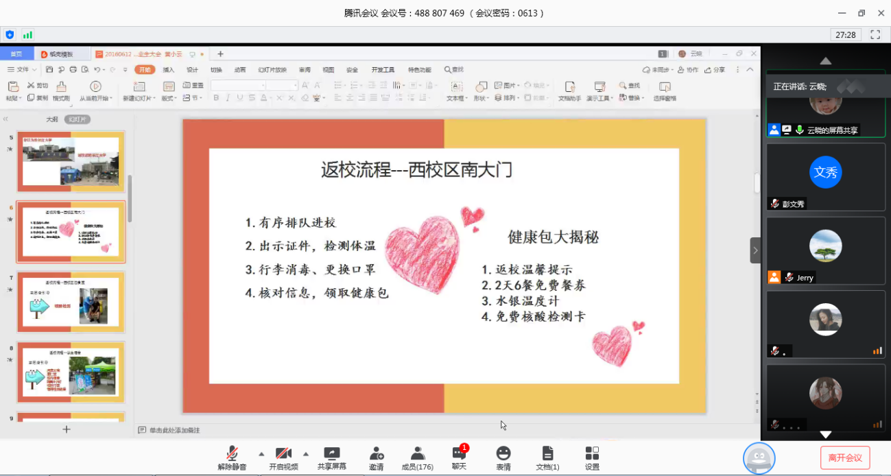 随后,黄小云从返校流程、毕业手续和就业工作三个方面进行了讲解。首先,毕业生入校时应做到有序排队进校,出示证件,检测体温,行李消毒、更换口罩,核对信息,领取健康包;其次,根据毕业流程做好上交安全告知书、毕业生登记表、体检表、图书、三方协议、考研员工录取通知书、调档函等各项工作;最后,呼吁大家尽快就业,领取报到证和档案寄出!