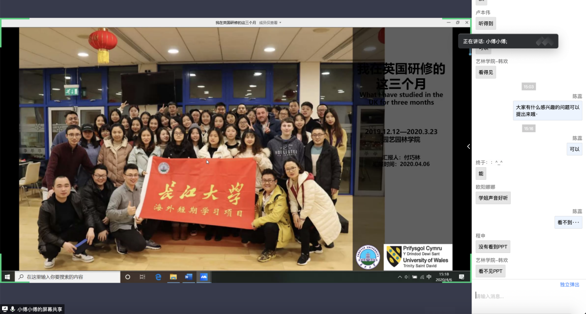 随后,张俊和付巧林两位同学图文并茂的分享了他们在海外交流的心得和体会。分别从三一圣大学的教程安排,学术收获,在英国的见闻感受等方面进行了生动的介绍。付巧林同学说,在国外她感受到更自由的学术讨论氛围,学习到了丰富的自然科学专业知识,强化了批判性思维能力。张俊同学表示,此次疫情期间出国交流最大的感受在于深深的体会到了祖国的强大,虽然回国路艰,但是在公司领导和老师们的关心和帮助下能够安全回国非常感恩。最大的收获在于跨文化交流技能提高和团队精神培养。最享受的是来自不同国家、不同专业同学们取长补短、相互协作、共同克服困难的过程。