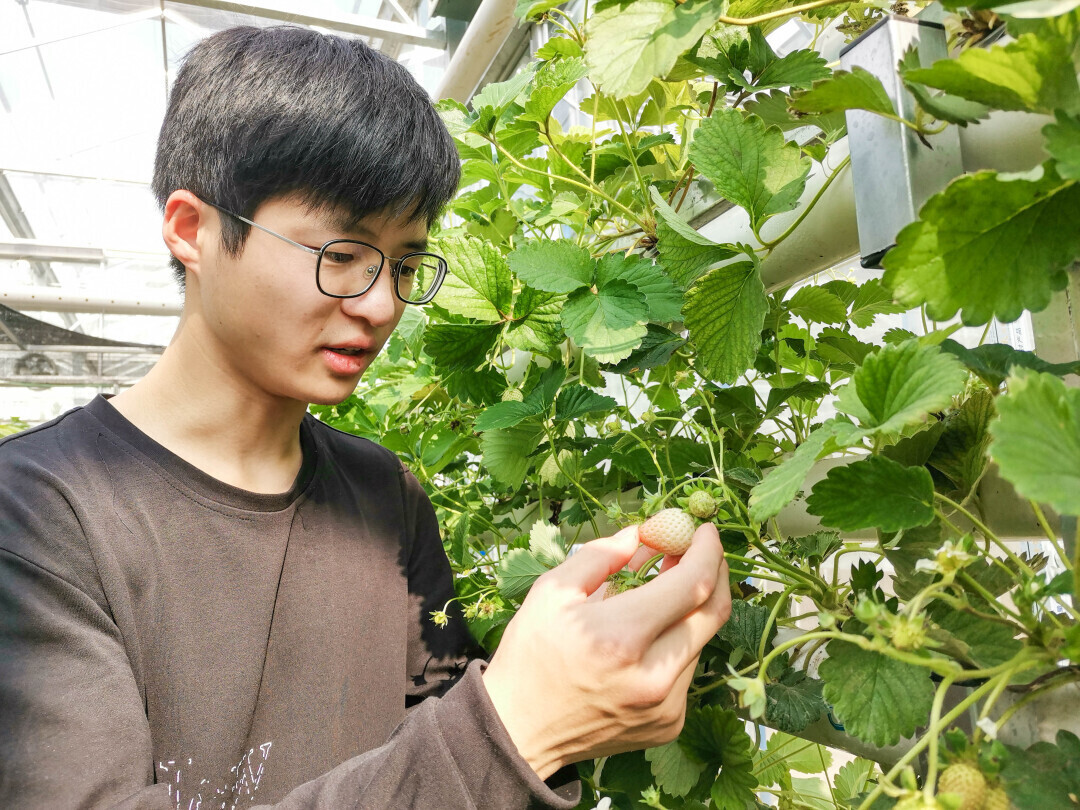 图为邬晓龙同学查看草莓着色情况