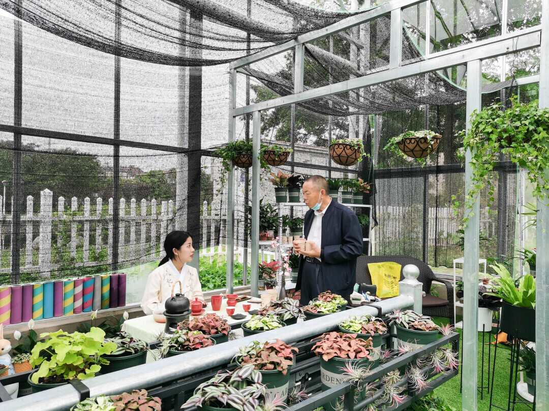 图为新生家长在温室内休憩,询问专业大体情况