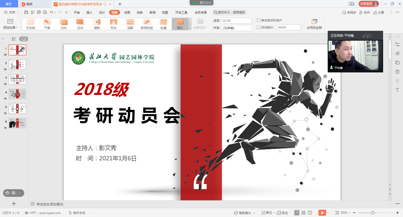 (通讯员:王挪 彭文秀)2021年硕士研究生招生考试刚刚结束,为了更早、更好地激发2018级本科生的考研热情和信心,帮助大家端正考研态度,解决备考过程中遇到的问题,tyc5997太阳集团于2021年1月6日10:00-12:00通过腾讯会议召开了2018级本科生考研经验交流暨动员大会。此次会议由学工办主任彭文秀主持,公司党委副书记平先锋参加了会议。
