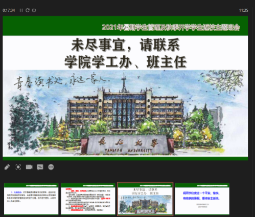 此次班会主要围绕四个方面进行:暑期在校员工管理、暑期在家(在外)员工管理、秋季开学返校安排、其他注意事项。会上由各班班主任和辅导员重点介绍公司对本科生、研究生暑期管理及秋季开学员工返校的相关要求。强调今日校园打卡任务必要性,杜绝每日遗忘打卡、上报虚假信息等,并表示如有此现象将会受到从严从重处分。接着班主任特意指出当前疫情防控形势严峻,疫情防控不容松懈,要求同学们非必要不外出,若必须外出应戴好口罩,勤洗手,注意通风等。同时不忘告诫同学们切勿隐瞒自己真实情况,一旦身体出现任何问题或其他需求,随时向辅导员或班主任寻求帮助。会议最后,班主任对员工暑期学习与作息时间管理方面了解情况并提出建议,并对开学与同学们的相见表示期许。