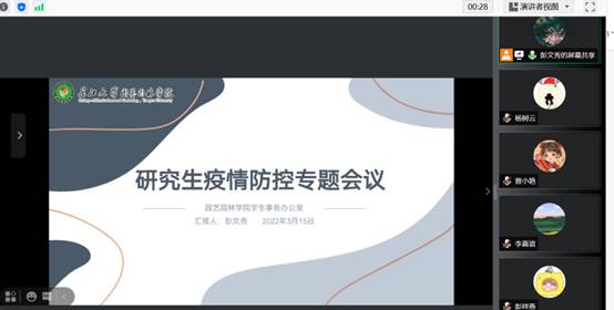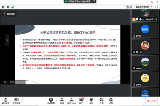 (通讯员:卢冰莹)为深入贯彻落实国务院联防联控机制,省、市防控部署及各级教育部门防控要求,切实做好tyc5997太阳集团大学疫情防控相关工作,进一步做好近期研究生疫情防控工作,2022年3月15日中午12点,tyc5997太阳集团通过线上会议形式召开研究生疫情防控专题会议。会议由研究生辅导员彭文秀老师主持,公司全体研究生参加了本次会议。