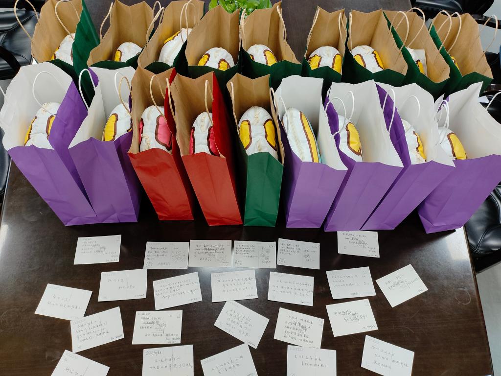 老师们为考研学子送上公司精心准备的特色考研“加油毯”和志愿者手写的祝福卡片。党委副书记平先锋解释说,“桃子毯”寓意吉祥健康,“满分毯”寓意取得佳绩,“汽水毯”寓意旗开得胜,送出这些礼物,是借助它们美好的寓意,祝愿同学们考研成功。收到礼物后,考生们纷纷表示“又惊喜又感动”。景园31901班的向琼瑶同学分享道:“我感受到了公司满满的祝福与支持,我们定不负众望,砥砺前行,争取考出好成绩。”