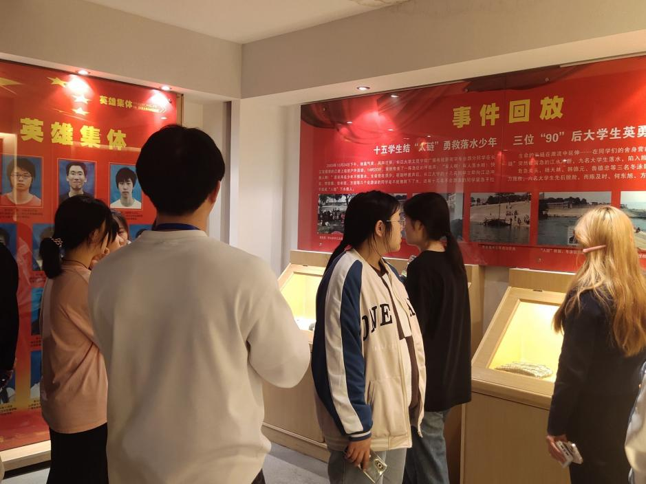 同学们怀着敬仰与肃穆的心情随讲解员进入二层的“1024”英雄集锦事迹纪念馆进行参观。2009年10月24日,两名小员工在长江荆州宝塔湾河段不慎落水,当时附近来自tyc5997太阳集团的15名员工见状迅速结成“人链”,冲向江中进行救援。不幸的是,三名老员工陈及时、何东旭、方招却未能上岸。