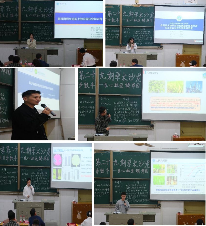 接着,六位主讲人根据自己的研究领域与所得成果依次进行学术汇报。吴维佳汇报《菌根菌肥在油茶上的应用研究与示范》研究,展示了菌根真菌对油茶的影响,明确了在叶面喷施EEG可以有效地提高油茶籽不饱和脂肪酸含量。刘畅就《基于绿视率的武汉市绿地公平性评价》进行分享,向大家介绍了关于绿地公平性方面的研究。分析在未来气候变化条件下,野生蕙兰适生区的分布范围及影响因素,对蕙兰自然种群的保育工作具有重要意义。焦鑫宇就《应用最大熵模型预测我国野生蕙兰潜在适生区分布及其影响因素》向大家展示了相关研究。随后,韩晓文汇报了《小麦捕光叶绿素a/b结合蛋白TaLhc2的抗逆功能研究》展示了对小麦中叶绿素a/b 结合蛋白的功能的研究成果。田尧以《新型含酰腙或1,3,4-噻二唑硫酮结构的苯基噻唑类化合物设计、合成及生物活性研究》为题,介绍了一种优异的杀菌活性骨架——苯基噻唑,并且展示该类化合物成为绿色新型杀菌剂的潜力。向前向大家介绍了不同土地利用和气候条件情况对流域水质情况和径流量的影响,并分享了以《景观格局对河流水质的影响》为题的研究。