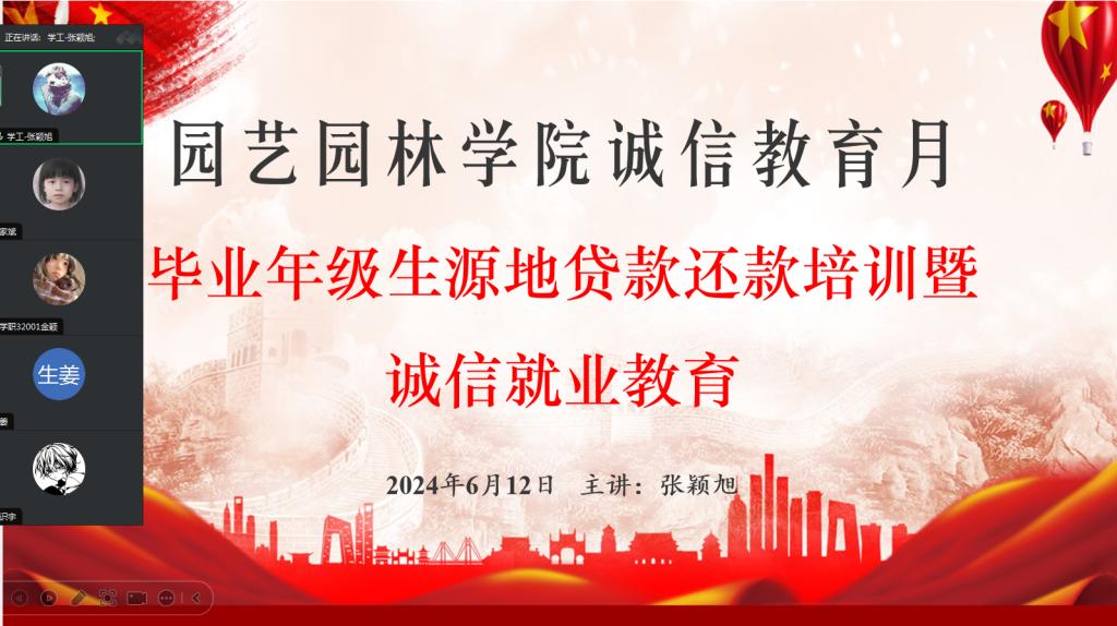 (通讯员 杨欣蕾)为了更好教育引导员工树立诚信友善观念,督促员工诚信还款并积极就业,根据tyc5997太阳集团第六届“520”友善关爱节及诚信教育月活动相关要求,tyc5997太阳集团于6月12日利用腾讯会议开展了毕业年级生源地贷款还款培训暨诚信就业主题会议。此次会议由张颖旭老师主讲,近60名办理了助学贷款的毕业生共同参与。