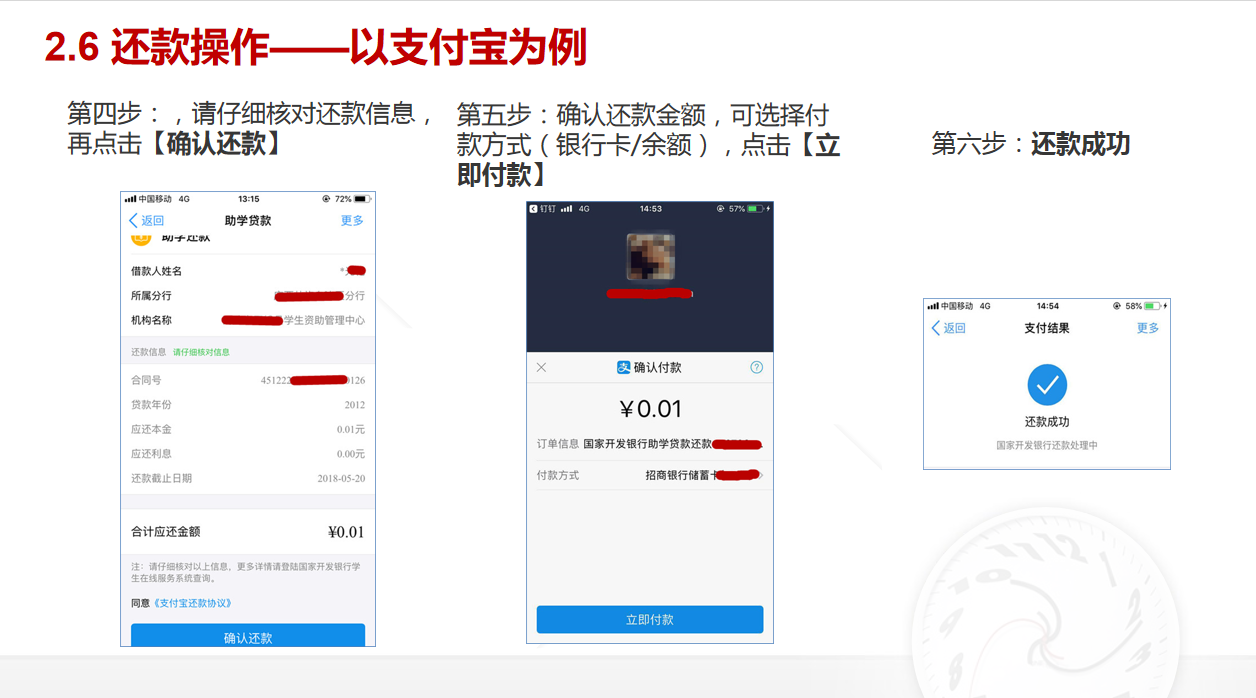 会议伊始,张颖旭讲述了如何在国开行生源地贷款系统确认毕业信息,解读了相关还款政策,并且着重强调了开始计算利息的时间以及逾期还款对于个人征信的影响。随后,他以支付宝APP还款为例,详细地讲解了每一项还款步骤。