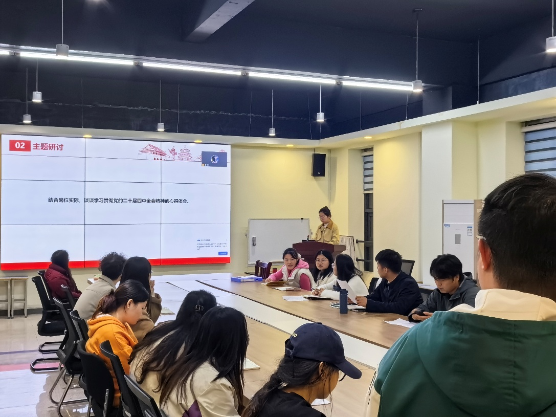 第一项,主持人周思涵带领学习习近平总书记重要讲话、重要批示精神,学习《关于〈中共中央关于制定国民经济和社会发展第十五个五年规划的建议〉的说明》及党的二十届四中全会精神。第二项,围绕学习贯彻党的二十届四中全会精神展开主题研讨,并谈心得体会。强调员工党员应该明确自己的历史使命和责任担当,胸怀“国之大者”,将个人理想融入祖国发展大局,锤炼本领,以过硬的专业技能应对未来不确定性挑战;第三项,学习《中国共产党章程》(第一章),每位党员依次朗读《中国共产党章程》(第一章)理论内容并相互讨论学习。第四项,学习《中国共产党纪律处分条例》、中央八项规定精神等内容,增强党性修养;第五项,全体党员起立重温入党誓词,增强身为党员的信念感和使命感。