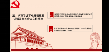 会议第三项学习习近平总书记重要讲话及有关文件精神。首先学习习近平总书记在纪念中国人民抗日战争暨世界反法西斯战争胜利75周年座谈会的讲话精神,“我们要弘扬伟大抗战精神,以压倒一切困难而不被困难所压倒的决心和勇气,勇于斗争,善于创造,锲而不舍地为实现中华民族伟大复兴而奋斗,直至取得最后胜利。”习近平总书记在纪念中国人民抗日战争暨反法西斯战争胜利75周年座谈会上的重要讲话,在解放军和武警部队引起强烈反响。广大官兵表示,作为新时代革命军人,一定要弘扬伟大抗战精神,聚力练兵备战,锐意开拓进取,坚决完成党和人民赋予的新时代使命任务,向着中华民族伟大复兴的光辉彼岸奋勇前进。习近平总书记还提出要坚持斗争精神,不辱神圣使命以及坚定捍卫和平,共创美好未来。