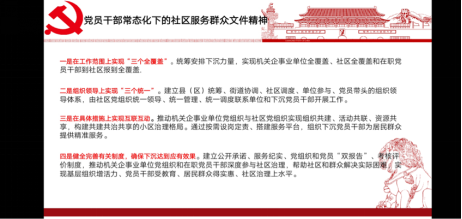 会议第五项学习了党员干部常态化下的社区服务群众文件精神,一是在工作范围上实现“三个全覆盖”;二是组织领导上实现“三个统一”;三是具体措施上实现互联互动;四是健全完善有关制度,确保下沉达到应有效果。