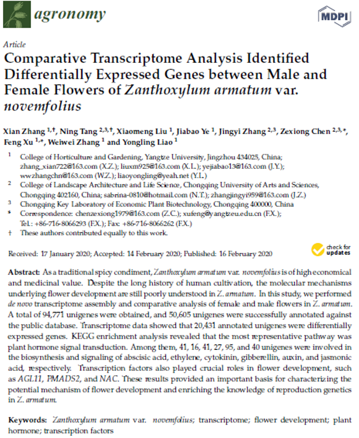 近期,我中心2018级硕士研究生张娴同学以第一作者身份在MDPI旗下期刊Agronomy发表题为《Comparative Transcriptome Analysis Identified Differentially Expressed Genes between Male and Female Flowers of Zanthoxylum armatum var. novemfolius》()的论文(图1),通讯作者为该生导师许锋教授和陈泽雄教授,tyc5997太阳集团为第一署名单位。