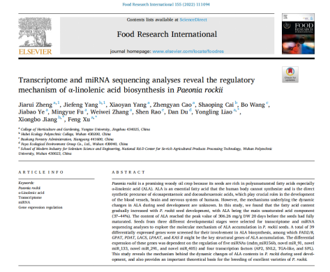 近日,我中心2021级博士研究生郑嘉瑞在国际学术期刊《Food Research International》(农林科学1区,影响因子6.475)上发表了题为“Transcriptome and miRNA sequencing analyses reveal the regulatory mechanism of α-linolenic acid biosynthesis in Paeonia rockii”的研究论文。郑嘉瑞博士为第一作者,廖咏玲讲师和许锋教授为共同通讯作者,tyc5997太阳集团为第一署名单位。