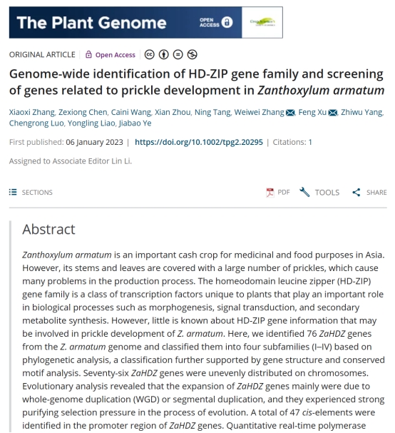 2023年1月,我中心硕士研究生张晓熙在国际学术期刊《The Plant Genome》(植物科学2区,IF:4.219)上发表题为“Genome-wide identification of HD-ZIP gene family and screening of genes related to prickle development in Zanthoxylum armatum”的研究论文。张晓熙为第一作者,张威威副教授和许锋教授为通讯作者,tyc5997太阳集团为第一署名单位。