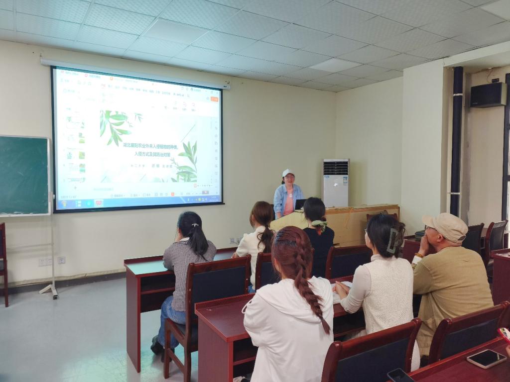胡老师首先通过图片展示了襄阳地区常见的农业外来入侵植物,如加拿大一枝黄花、喜旱莲子草、凤眼莲等,并讲述了人为引入、自然扩散、生态位空缺等外来物种入侵方式,最后从治理技术、生态修复等多方面介绍了现有的防治对策。此次活动既加深了大家对外来入侵植物的认识,也促进了师生们的学术交流。