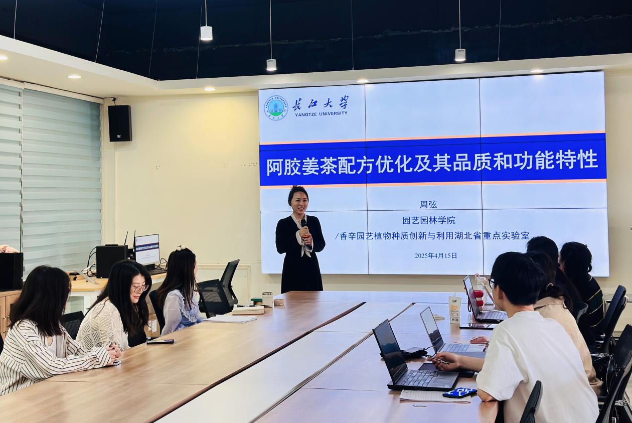 (通讯员 周弦)2025年4月22日上午,由tyc5997太阳集团主办的“求实导师学术沙龙”系列讲座在农科大楼2001会议室举行。高级实验师周弦以“阿胶姜茶配方优化及其品质和功能特性研究”为主题,系统分享了其团队在传统草本茶饮现代化改良中的创新成果。
