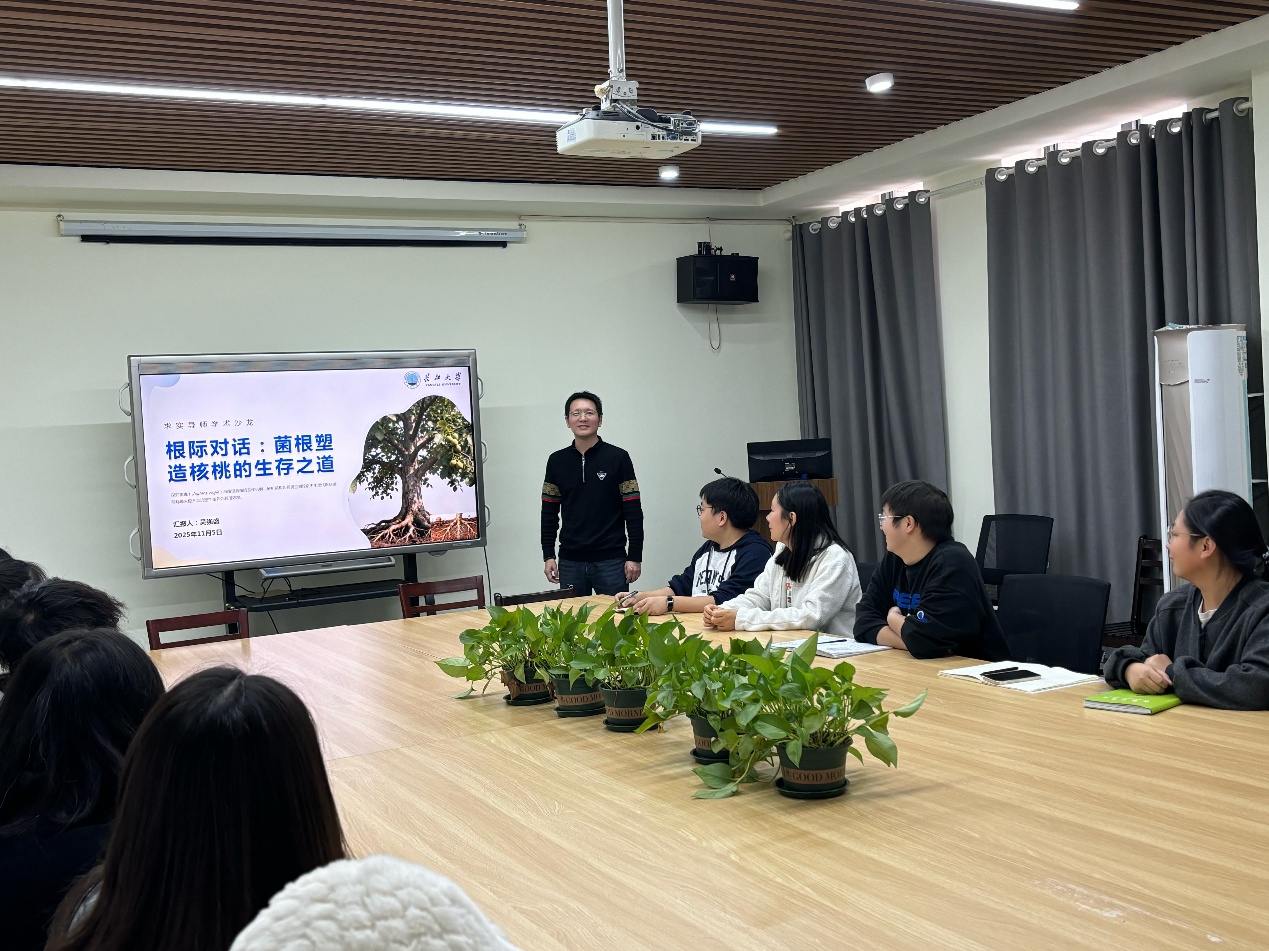 (通讯员:郑凤玲)2025年11月6日下午,公司在3002B会议室举行了主题为“根际对话:菌根塑造核桃的生存之道”的学术讲座,吴强盛教授为主讲人,园艺方向青年教师和硕士研究生参与本次学术报告。